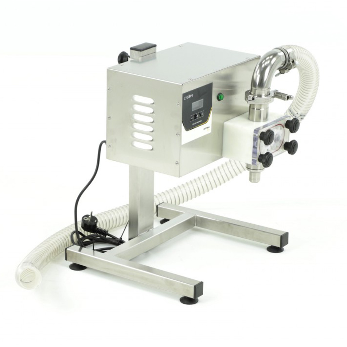 Lysoň Optima plnička na sklenice s medem. Plničku lze použít nejen na stáčení medu ale dá se po úpravách použít i na jiné kapaliny podobné konzistence, například hořčici, kečup, různé mléčné produkty, olej atd.. Plnička na med umožňuje velmi variabilní nastavení v malých provozech.