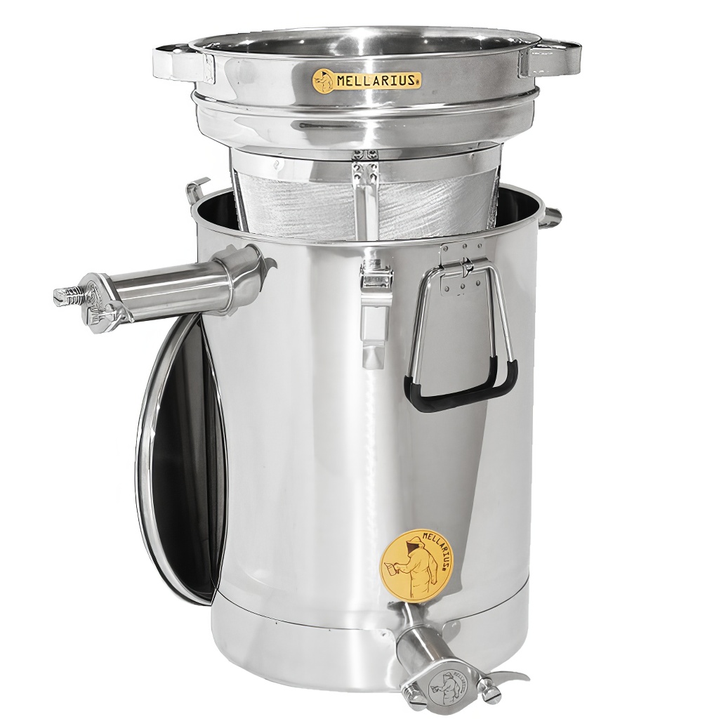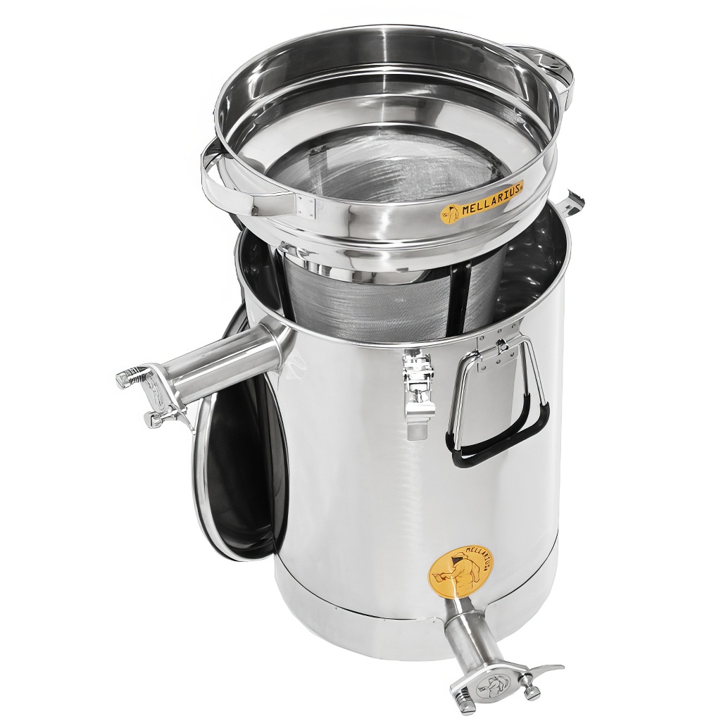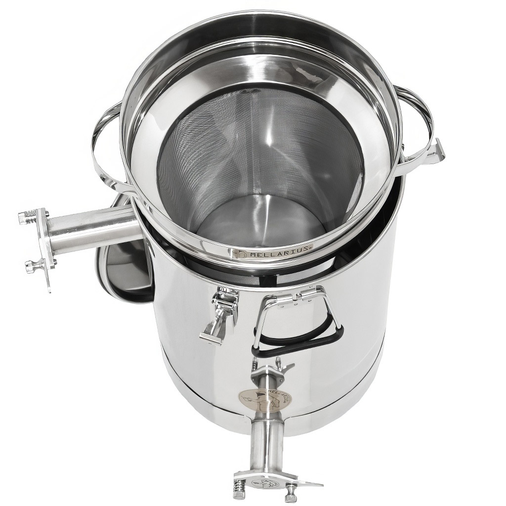Nádoby na med Mellarius v několika variantách, v tomto případě s vyspádovaným dnem, těsnícím víkem a dvěma navařenámi nerezovými kohouty, které dovolují nádobu používat jako čeřící nádobu na med. Jsou vyráběny z kvalitní nerezové oceli, určené pro potravinářské účely o dostatečné síle (0,8 až 1 mm), tak aby nemohlo jednoduše docházet k nechtěným promáčklinám. Všechny části nádob jsou kvalitně svařeny za pomoci plazmového svařování. Při konstrukci je kladen důraz na hladné povrchy, které lze snadno čistit, proto jsou nádoby vyrobeny z leštěných nerezových plechů. Všechny naše nádoby jsou opatřeny nerezovými madly pro snadné přenášení. Součástí balení je také nerezové síto, které můžete vložit do nádoby a pomocí horního kohoutu ji využívat jako čeřící nádobu.