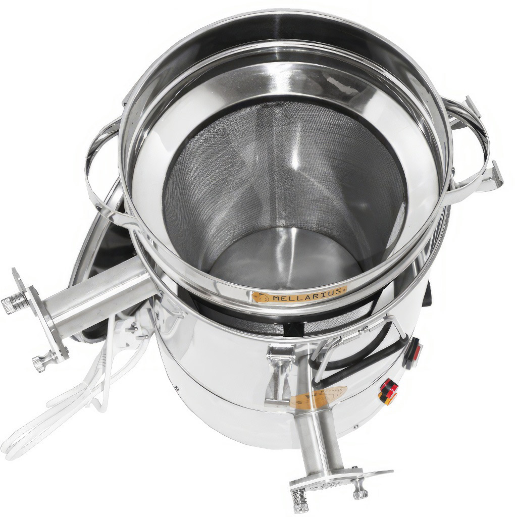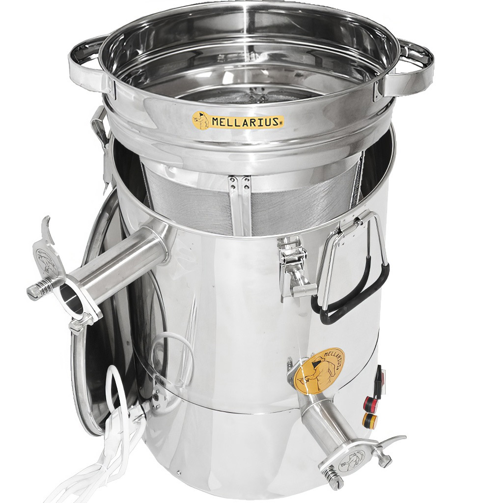 Nádoby na med Mellarius v několika variantách, v tomto případě s vyspádovaným dnem, těsnícím víkem a dvěma navařenámi nerezovými kohouty, které dovolují nádobu používat jako čeřící nádobu na med. Součástí těchto nádob je integrovaná topná podložka, díky které můžete med udržovat v ideální konzistenci po celou dobu plnění. Jsou vyráběny z kvalitní nerezové oceli, určené pro potravinářské účely o dostatečné síle (0,8 až 1 mm), tak aby nemohlo jednoduše docházet k nechtěným promáčklinám. Všechny části nádob jsou kvalitně svařeny za pomoci plazmového svařování. Při konstrukci je kladen důraz na hladné povrchy, které lze snadno čistit, proto jsou nádoby vyrobeny z leštěných nerezových plechů. Všechny naše nádoby jsou opatřeny nerezovými madly pro snadné přenášení. Součástí balení je také nerezové síto, které můžete vložit do nádoby a pomocí horního kohoutu ji využívat jako čeřící nádobu.
