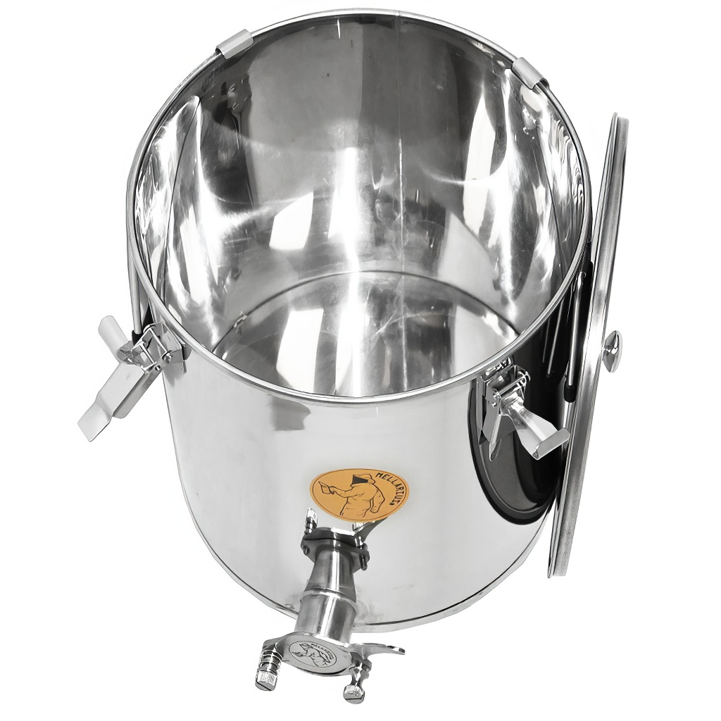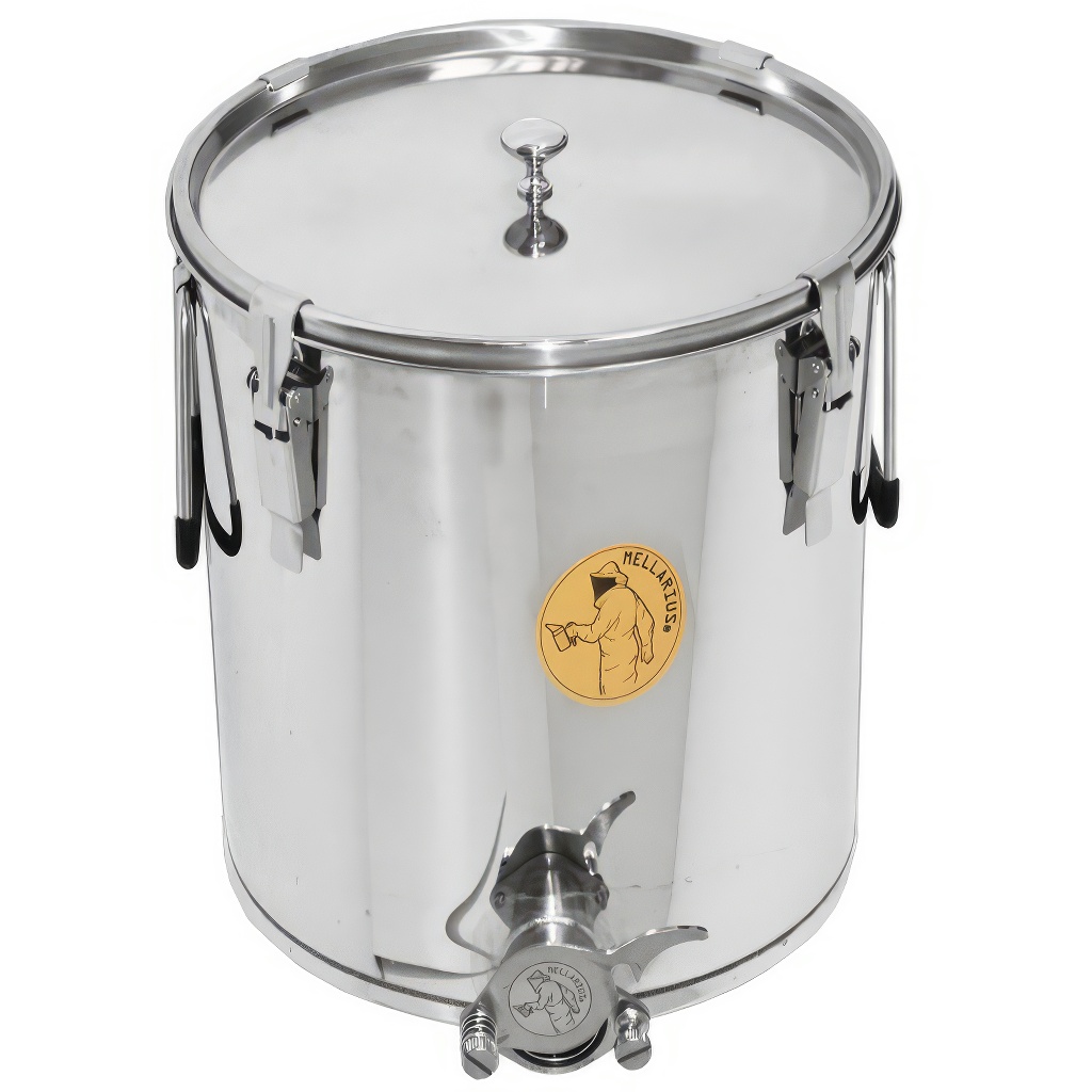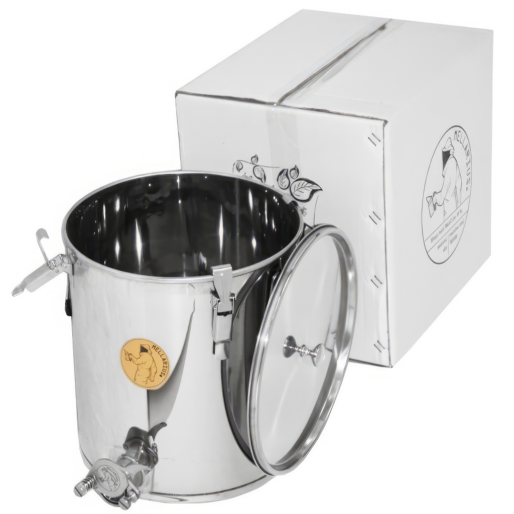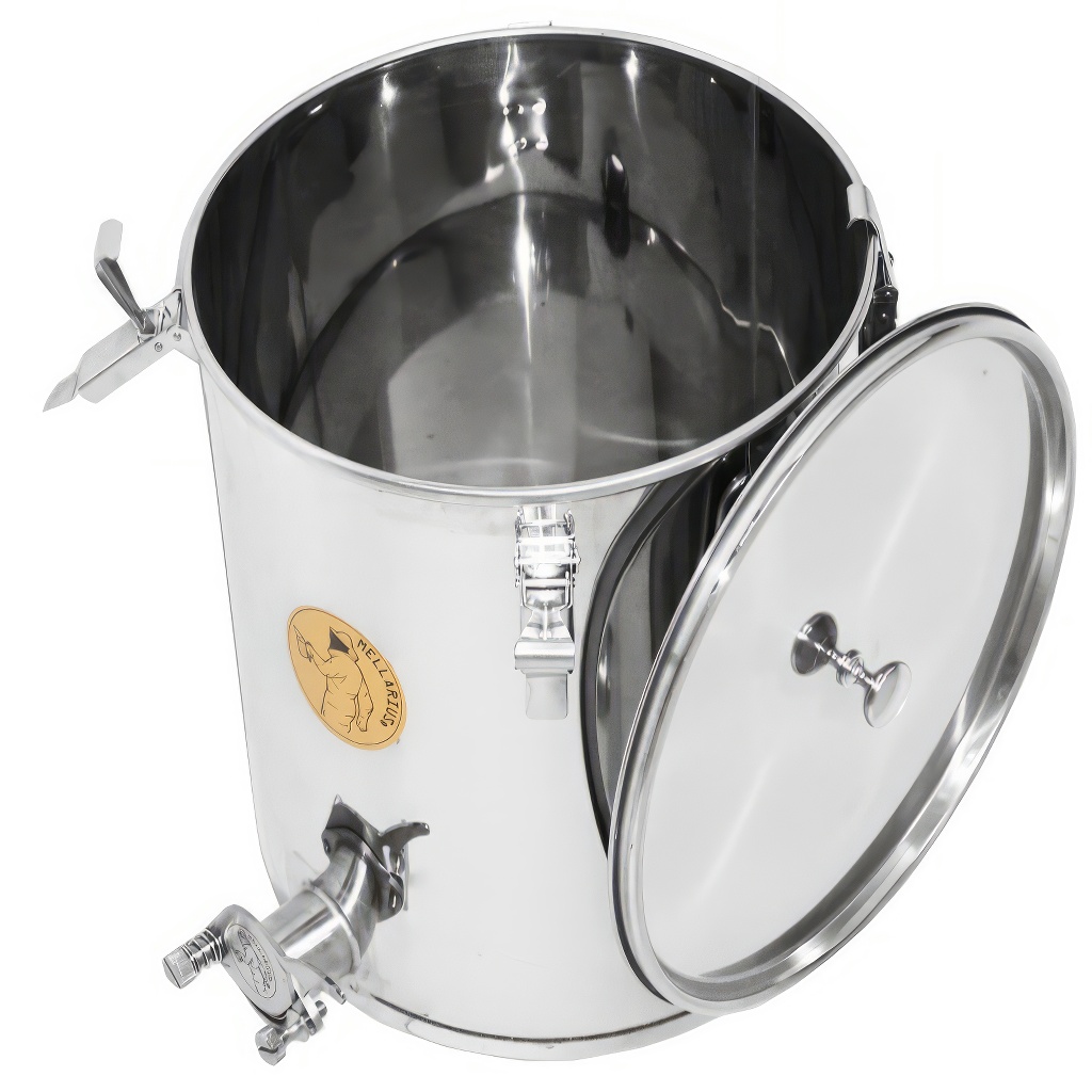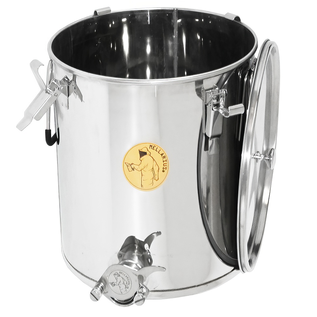 Nádoby na med Mellarius v několika variantách, v tomto případě s navařeným nerezovým kohoutem pro maximální pevnost. Jsou vyráběny z kvalitní nerezové oceli, určené pro potravinářské účely o dostatečné síle (0,8 až 1 mm), tak aby nemohlo jednoduše docházet k nechtěným promáčklinám. Všechny části nádob jsou kvalitně svařeny za pomoci plazmového svařování. Při konstrukci je kladen důraz na hladné povrchy, které lze snadno čistit, proto jsou nádoby vyrobeny z leštěných nerezových plechů. Všechny naše nádoby jsou opatřeny nerezovými madly pro snadné přenášení.
