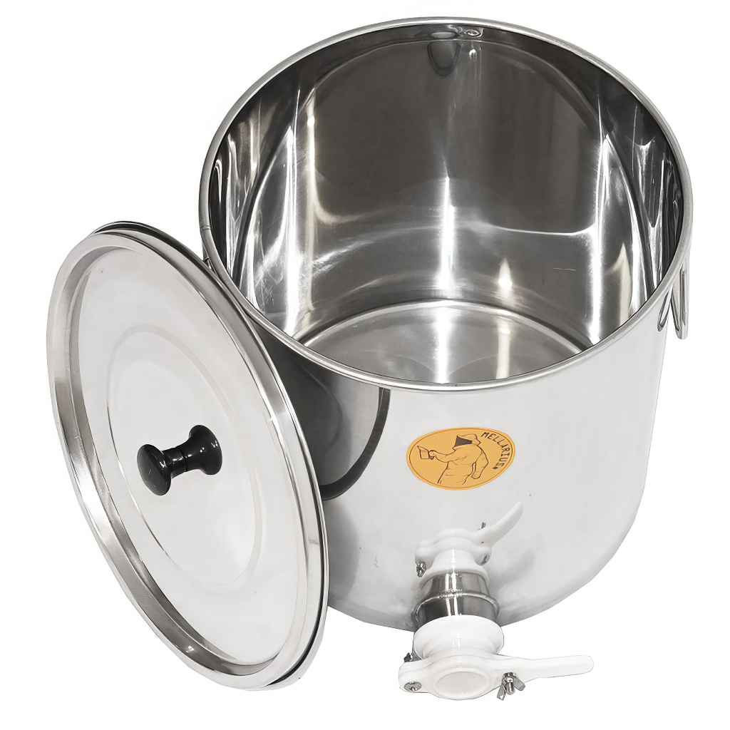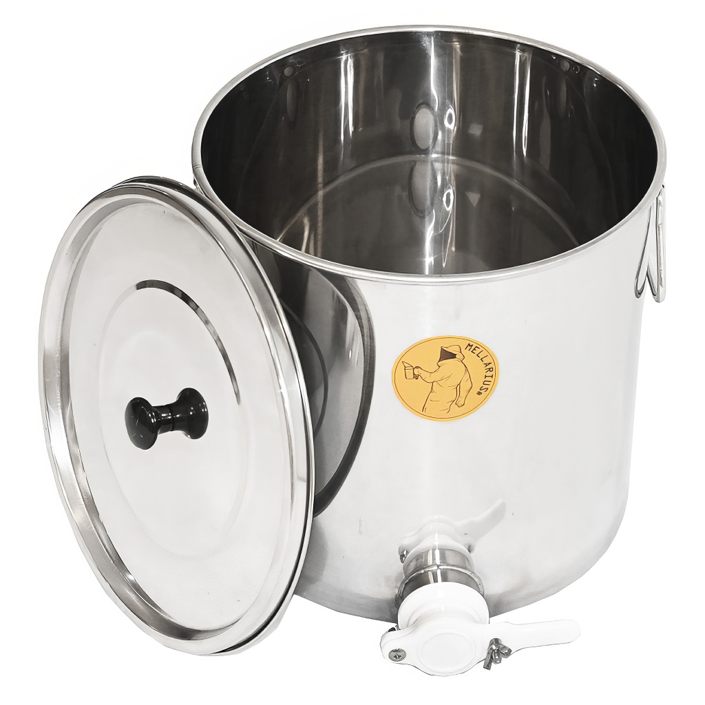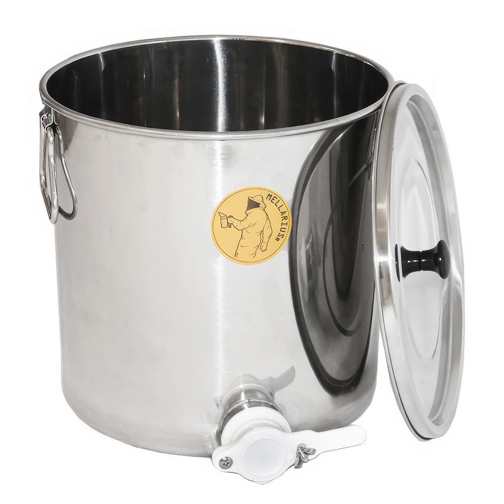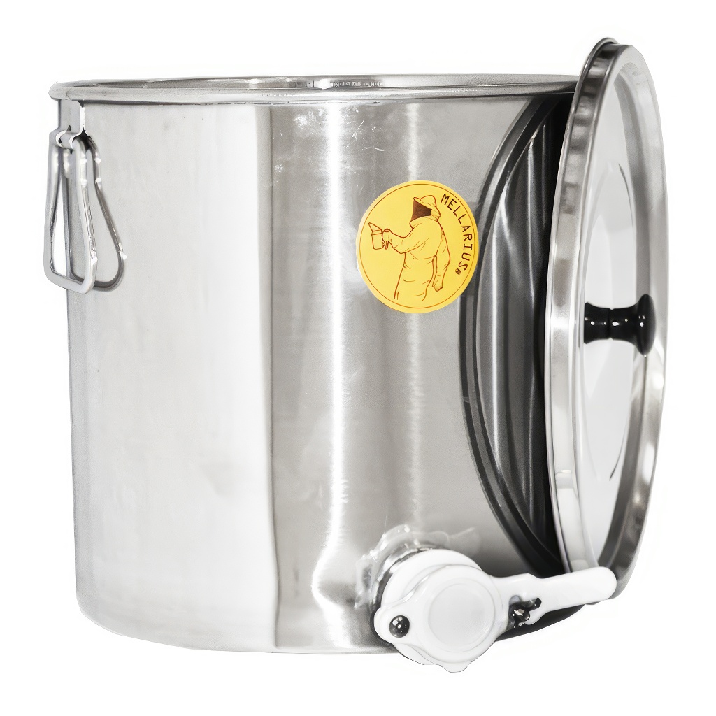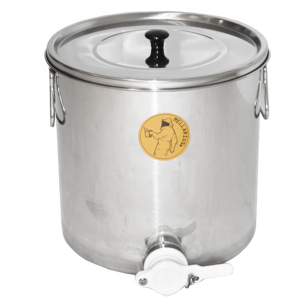 Stáčecí německá nerezová nádoba Mellarius na 25 kg medu s plastovým kohoutem a nerezovým víkem. Kvalitní stáčecí nádoba jenž pojme 25 kilogramů medu. Stáčecí nádoba je vyrobena z potravinářského nerezu. Nádoba je opatřena jedním stáčecím plastovým ventilem. Nerezové stáčecí nádoby s dlouhou životností. Stáčecí nádoby zaručují pohodlnou práci a snadné stáčení medu. Rozměry: výška 29 cm, průměr 30,1 cm. Produkt od zahraničního dodavatele včelařských potřeb.