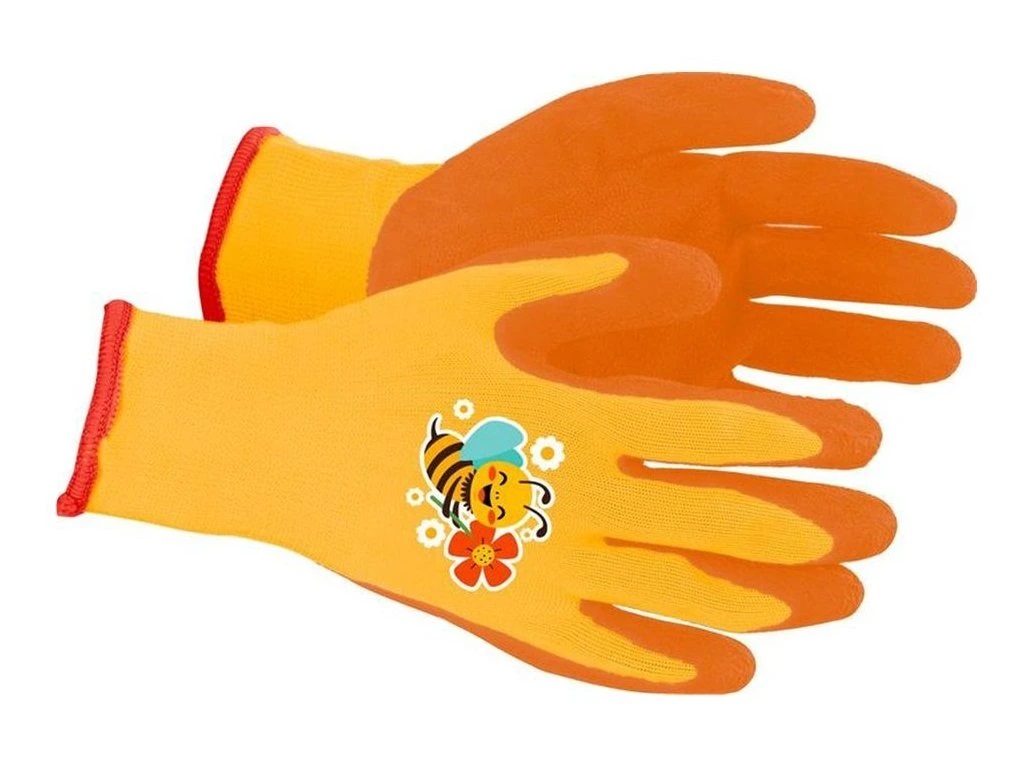 Rukavice zahradní dětské dívčí s včelkou .Barva: oranžová. Design: s včelkou. Veselé dívčí rukavice jsou nutné pro práci na záhradě. Potěší každého malou pomocnici. Ochrání ruce a zároveň bude každá práce zábavou. Vyrobené z polyesteru a potřené vrstvou latexu.
